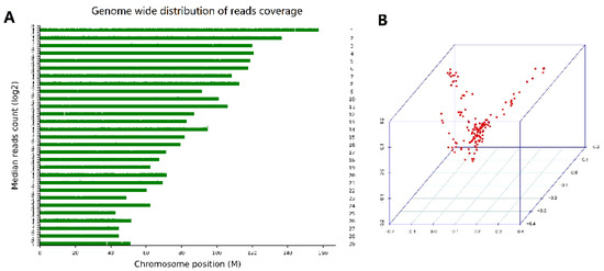 Read density distribution on 29 chromosomes. (A) Population structure plots based on 150 goats. The first three principal components (PCs) were used to display the population structure by a 3D plot (B).