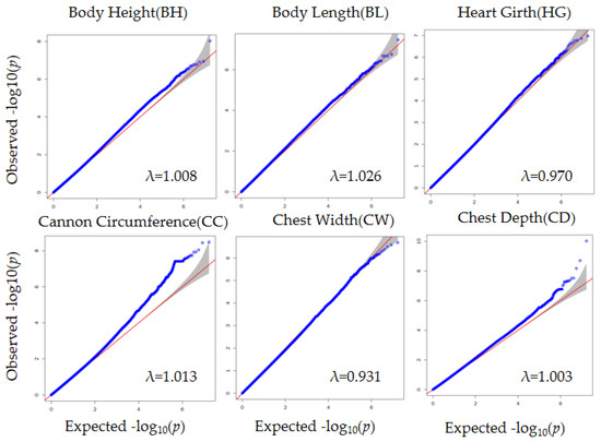 Quantile-quantile (QQ) plots of the six traits (BH, BL, HG, CC, CW, and CD) drawn by the expected p-value (the uniformly distributed quantile from 0 to 1) and observed p-value for each SNP. The shaded parts are the confidence intervals. λ: genomic inflation factor.