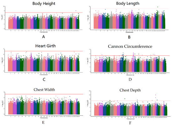 Manhattan plots of the BH (A), BL (B), HG (C), CC (D), CW (E), and CD (F) drawn by the observed p-value for each SNP. The red horizontal lines in the Manhattan plots show the significance threshold (6.01 × 10−8).