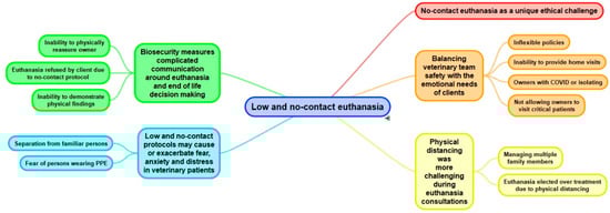 We identified five major themes relating to euthanasia: no-contact euthanasia as a unique ethical challenge; balancing veterinary team safety with the emotional needs of clients; low and no-contact protocols may cause or exacerbate fear, anxiety and distress in veterinary patients; physical distancing is more challenging during euthanasia consultations; and biosecurity measures complicated communication around euthanasia and end- of-life decision making (Figure 1).