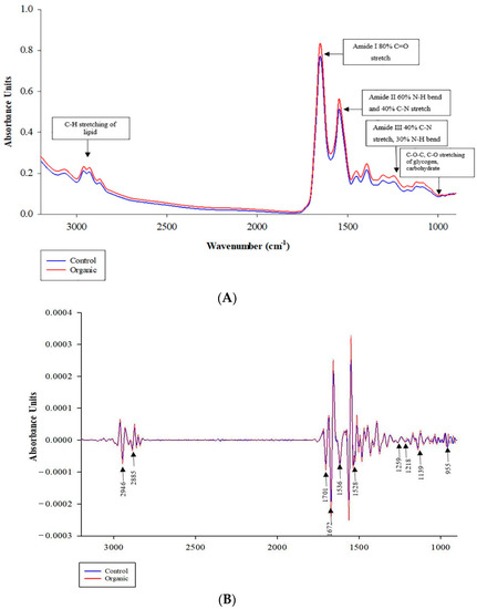 Average SR-IR spectra of original (A) and second derivative (B) from KRC chicken breast meat between control and organic raising systems. Infrared spectra were collected in the spectral range of 4000 to 900 cm−1, resolution 4 cm−1 based on 300 spectra per treatment. 3000 to 2800 cm−1 (CH stretch of lipid); 1740 cm−1 (C=O ester of lipid); 1700 to 1600 cm−1 (amide I); 1600 to 1500 cm−1 (amide II); 1338 cm−1 (amide III); and 1250 to 900 cm−1 (carbohydrate and glycogen) parameters used for the collected spectra.