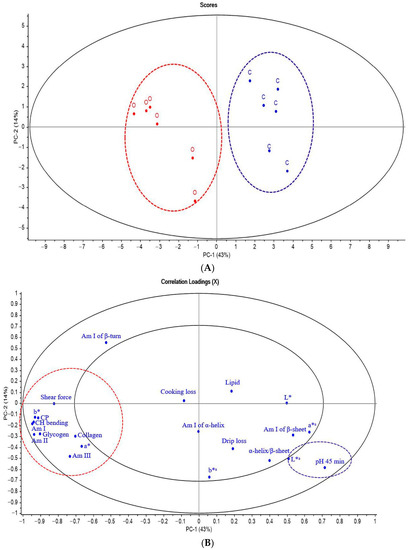 To elucidate the relationship between biochemical compounds and the quality of breast meat (Figure 2A) from the two raising systems, we combined data from FTIR spectra related to biomolecules and physicochemical properties of chicken meat and then used PCA to classify the CO and OR groups. As shown in Figure 2A, the meat of chickens from different raising systems was separated, representing 57% of the total variability of all data sets.