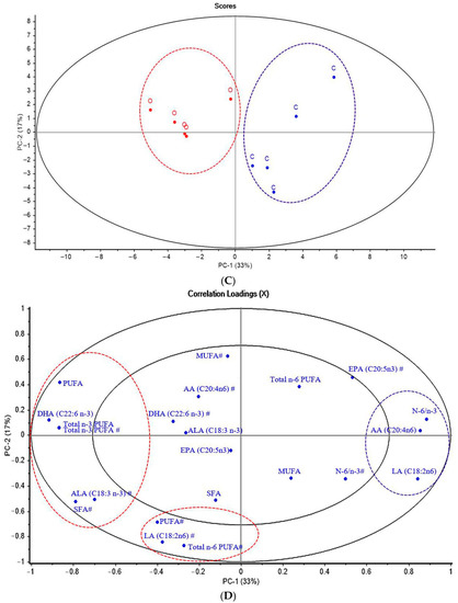 The negative loading plot in Figure 2D shows that PUFA, n-3 PUFA in the breast and thigh, ALA, SFA, and LA in thigh and DHA in breast meat were positively correlated with the negative score plot from chicken meat in the OR group. The positive loading plot in Figure 2D shows that the ratio of n-6 to n-3 PUFA was positively correlated with the positive loading plot of CO but negatively correlated with the negative score plot of chicken meat from OR.