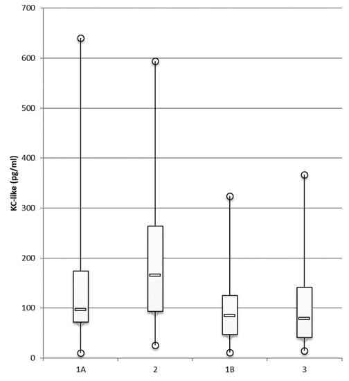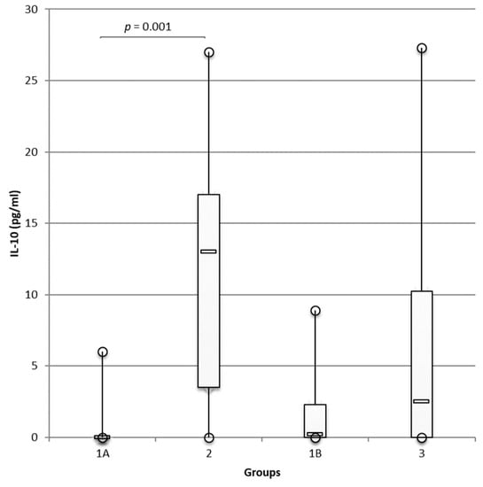 Similarly, IL-10 concentrations were significantly higher in group 2 than in group 1A (p = 0.001; Figure 2). IL-10 concentrations were also higher in group 3 than in group 1B control dogs, but the differences were not significant.