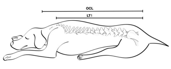 After induction of anaesthesia, all dogs were positioned in sternal recumbency with the pelvic limbs pulled forward. The OCL was measured from occipital bone to the first coccygeal vertebra. The desired extension of the epidural block was determined by measuring the length from the first coccygeal to the first thoracic vertebra (LT1) (Figure 1). All measurements were made using a standard meter.