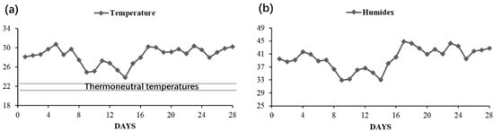 4.1. Humidex, Rectal Temperature, and Respiratory Frequency