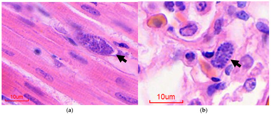Histological diagnosis of avian malaria in penguins, hematoxylin and eosin-stained sections: (a) Heart, extraerythrocytic meront (arrow); (b) Lung, intraendothelial extraerythrocytic meront (arrow).