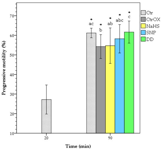 Progressive motility of boar spermatozoa under oxidative stress. Spermatozoa with straightness ≥ 80% were selected as progressive. Different letters indicate significant differences (p < 0.05) among treatments at 90 min of incubation. The asterisks indicate significant differences (p < 0.05) of samples compared to Ctr at 20 min of incubation. CTR = control; CtrOX = control under oxidative stress; NaHS = 100 nM; SNP = 100 nM; DD = SNP 100 nM + NaHS 100 nM. Data are shown as mean ± SD of 6 replicates.