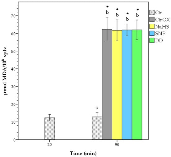Levels of lipid peroxidation of boar spermatozoa under oxidative stress. Different letters indicate significant differences (p < 0.05) between treatments at 90 min of incubation. The asterisks indicate significant differences (p < 0.05) of samples compared to Ctr at 20 min incubation. CTR = control; CtrOX = control under oxidative stress; NaHS = 100 nM; SNP = 100 nM; DD = SNP 100 nM + NaHS 100 nM. Data are shown as mean ± SD of 6 replicates.