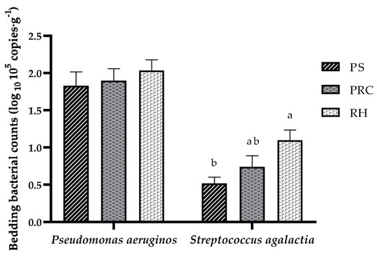 Counts of Pseudomonas aeruginos and Streptococcus agalactia in the bedding materials. PS = peanut shells, PRC = peanut–rice combination, RH = rice husks. Means ± SEM with different letters (a, b) differ (p < 0.05).