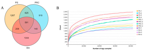 Venn diagram showing the number of unique and shared operational taxonomic units (OTUs) (A). High-throughput sequencing tag numbers and sequencing depth (B). PS = peanut shells, PRC = peanut–rice combination, RH = rice husks.