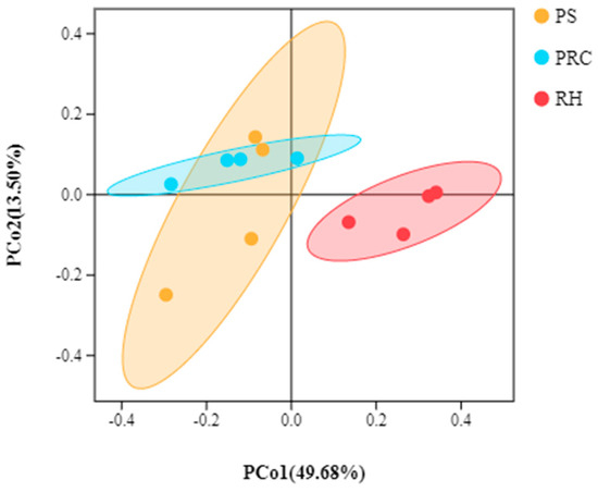 Principal coordinates analysis (PCoA) plot of colostrum samples. PS = peanut shells, PRC = peanut–rice combination, RH = rice husks. Overlap within two habitats indicated that exposure to different bedding types had similar bacterial community compositions of colostrum samples, if not the bacterial community was different.