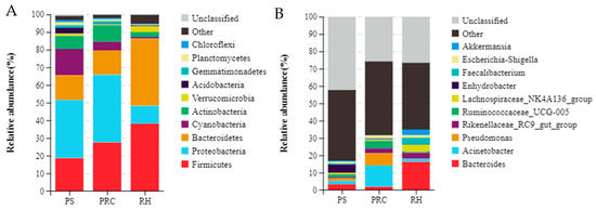 Bacterial composition in colostrum at the phylum (A) and genus (B) level for dairy cows from different bedding materials. PS = peanut shells, PRC = peanut–rice combination, RH = rice husks.