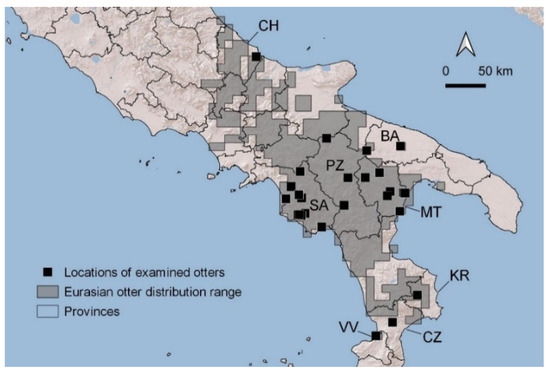 Distribution of collection sites of otters examined during the study. Abbreviations for provinces where otters were found, are showed: CH = Chieti; SA = Salerno; PZ = Potenza; MT = Matera; BA = Bari; KR = Crotone; CZ = Catanzaro; VV = Vibo Valentia.