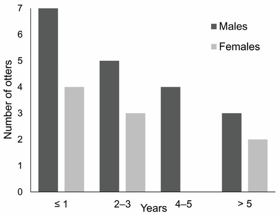 The age distribution of submitted otters was skewed towards younger individuals in both sexes. A left-skewed age structure was commonly reported in PM studies of otters across Europe [39,40,41,42] (but see [30], where the majority of road-killed otters were aged individuals). Young individuals are less experienced and more prone to die due to traffic collision. The maximum estimated age of 10 years found in this study is comparable to that detected in other studies across Europe [17,43], but see [39].