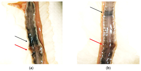Uterine horns ((a) left, and (b) right) of a 7-year-old female otter showing placental scars (black arrows) and early placentations (red arrows).