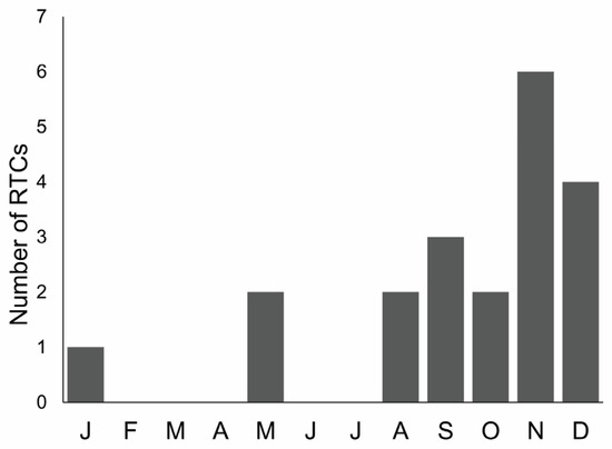Monthly distribution of otter road-traffic collisions (RTCs) during the study.