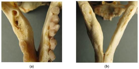 Dental lesions: Forty-six percent of examined animals showed intra vitam dental lesions or injuries. One female and eight males, aged between 1 and 8 years, had fractured canines. Three of these males, respectively 3, 6 and 8 yrs old, also had damaged or missing incisors. Dental malocclusion and caries were also recorded in three and two adult males, respectively. In one of these cases, multiple oral mucosal lesions resulted from irritation caused by dental malocclusion. A male otter <2 yrs old also showed moderate periodontitis around canines and incisors, in association with moderate and diffuse palatal stomatitis. In addition, skull examination of a 5-year-old male revealed maxillary bone resorption exposing upper carnassial (PM4) roots and the almost complete absence of alveolar processes of the lower carnassial, in association with loss of this tooth and mandibular thickening, suggesting the presence of osteomyelitis due to chronic periodontitis (Figure 5).