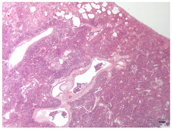 Lung of a female otter affected by severe fibrino-purulent pleuropneumonia: an extensive area of diffuse inflammatory infiltration is visible (HE; bar = 90 μm).