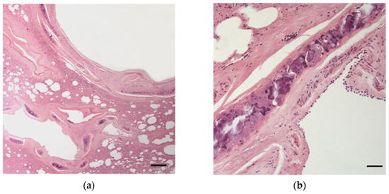 Otter lung showing variably extensive mineralization of bronchial cartilages: the right image shows a higher magnification of the central foci of mineralization (HE; bar = (a) 90 μm; (b) 25 μm).