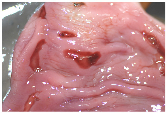 Alimentary system: Oral or esophageal lesions other than the previously described bite wounds or dental lesions were not detected in the examined otters. In 21 otters, the gastric wall was intact at the time of PM examination. In most of cases (62%), the stomach was empty, sometimes in association with a moderate amount of clear or slightly blood-tinged gastric mucus, or the stomach contained a few prey residuals. Only one male, dead due to severe gastritis, showed multifocal ulcerated lesions on the gastric mucosa (Figure 8), whereas one female, dead due to fibrino-purulent pleuritis and peritonitis, also showed multiple gastric mucosal erosions, in addition to the presence of multifocal areas of adhesion involving the intestinal serosa and parietal peritoneum. In the remaining cases, the most frequently found type of food was constituted by fish (67%, mainly cyprinids, but also eels and brown trout), followed by anurans (33%), invertebrates (25%) and the freshwater crab Potamon fluviatile (8%).
