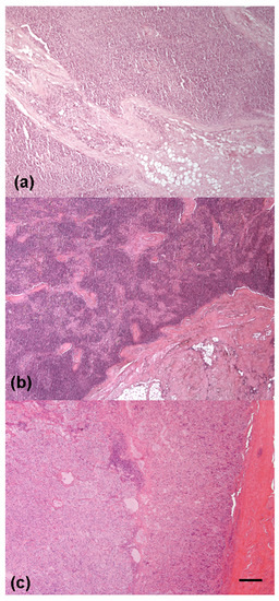 Male otter with multicentric lymphoma: monomorphic population of lymphoid cells invading the lymph node capsule (a) and the splenic parenchyma (b); (c) multifocal, moderate lymphoid infiltrations in the adrenal gland (HE; bar = (a) 50 μm; (b,c) 100 μm).