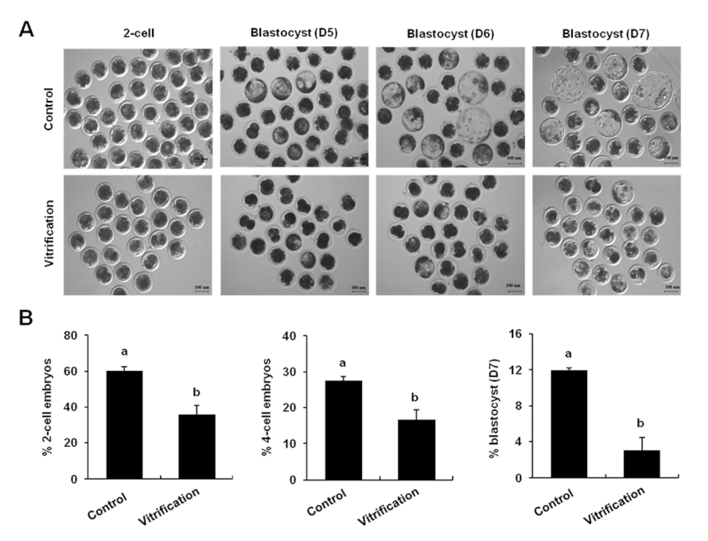 3.1. Vitrification of Pronuclear Zygotes Reduced the Developmental Efficiency of Parthenogenetic Activation Embryos