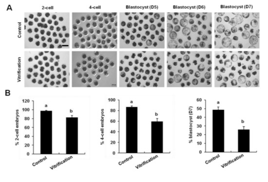 Vitrification is widely used to preserve animal genetic resources in agriculture and human gametes and embryos in reproductive medicine [1,2]. Vitrification has been successfully applied to mammalian embryos from different species, such as humans [3,4], mice [5], cattle [6], sheep [7], and pigs [8,9]. However, the vitrification frequently posed cryoinjuries of embryos, such as cytoskeletal damage [10,11], mitochondrial dysfunction [12], DNA structure breakage, chromosome abnormalities [13], cell apoptosis [10,14]. In addition, vitrification also caused reactive oxidative species (ROS) accumulation, defective epigenetic modifications [15], abnormal expression of imprinted genes [5], and failure of blastocyst formation [6,16]. However, the effect of vitrification on zygotic genome activation (ZGA) during early embryonic development remains unclear.