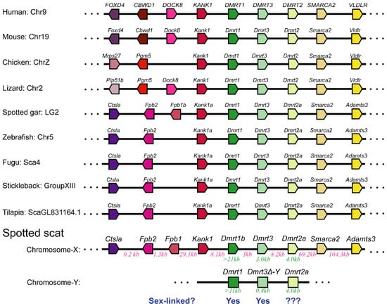 Syntenic analyses of Dmrt1 and Dmrt3 and their adjacent genes in different species. The figure was adopted with modifications from []. The bar lengths are disproportionate to the distances between genes. Dmrt1 and its downstream gene Dmrt3△-Y are sex-linked in spotted scat, whiles Dmrt2a is unknown. The distance between spotted scat Dmrt genes is shown in red (in kb). The lengths of Dmrt genes are shown in green (in kb). The neighbor genes of Dmrts on the X-chromosome were obtained from our previous XX genomic data (https://ngdc.cncb.ac.cn/search/?dbId=gwh&q=GWHAOSK00000000.1, accessed on 5 February 2022).