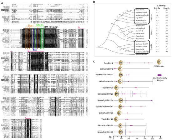 Homologous comparison of spotted scat Dmrt2a and Dmrt2b amino acid (aa) sequences with other species. (A) Alignment of Dmrt2a and Dmrt2b (aa) from different species. Amino acid (aa) sequences are numbered to the right. The dark overline indicates the conserved DM domain region. The two intertwined zinc-binding sites, site I (CCHC) and II (HCCC), are shown. The putative nuclear localization signal NLS is indicated. Red over lines numbered a, b, and c are other Dmrt2 conserved regions. Asterisk indicates the conserved cysteine and histidine residues. (B) Phylogenetic analysis of Dmrt2 proteins from different species based on outgroup of spotted scat Dmrt5. The neighbor-joining method of MEGA 6 was used to develop the tree. Numbers on nodes indicate the credibility of the branches using 1000 bootstrap replicates. Asterisks indicate cloned spotted scat Dmrt2a and Dmrt2b and clustered among their counterparts. The identities of spotted scat Dmrt2a and Dmrt2b amino acid sequences with other spices are shown on the right side. (C) Schematic representation of Dmrt2 domain features of different species predicted by SMART (http://smart.embl-heidelberg.de/, accessed on 17 October 2021). The scale bar indicates the length of amino acids (aa) in base pairs (bp). The hexagons indicate DM domain regions. The accession numbers of the sequences used are described in Table S2.
