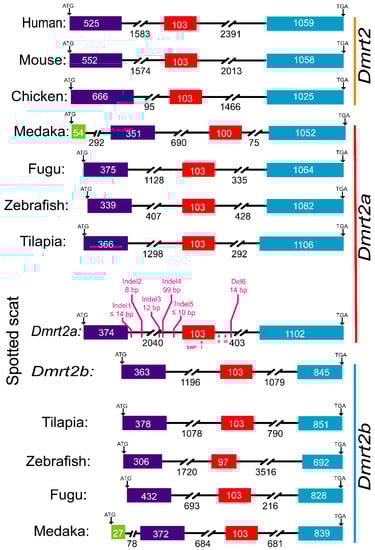 Schematic representation of Dmrt2a and Dmrt2b genes from different species. Boxes and lines indicate exons and introns, respectively. The same colors indicate the same exons. The lengths in bp (base pair) of exons are shown in the boxes, while introns are shown below. Downward arrows indicate start (ATG) and stop (TGA/TAA) codons. Red vertically inclined lines indicate insertions and deletions (indels) on spotted scat Dmrt2a. The polymorphisms in Dmrt2a were obtained from the differences in male and female sequences.