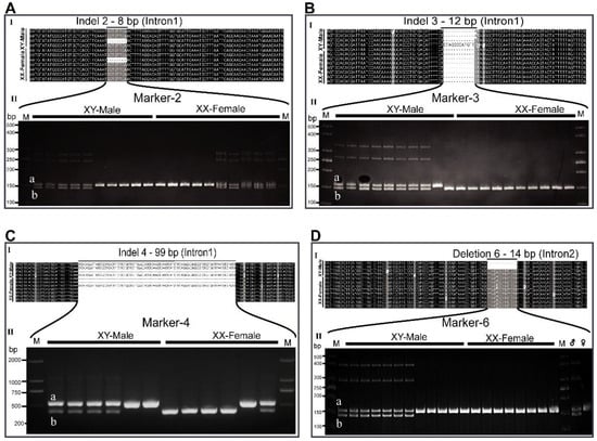 On the contrary, primers pairs of marker-2, marker-3, marker-4, and marker-6 spanning indel2, indel3, indel4, and del6, respectively, are partially sex-linked (Figure 4). Indel2, indel3, and indel4 are 8 bp, 12 bp, and 99 bp long, respectively, on intron 1, while del6 is 14 bp long on intron 2 (Figure 4A–D). Marker-2, marker-3, marker-4, and marker-6 showed double bands in most males and single bands in most females. The upper and lower fragments are as follows: marker-2 (a, 147 bp; b, 139 bp); marker-3 (a, 160 bp; b, 148 bp); marker-4 (a, 543 bp; b, 444 bp); marker-6 (a, 158 bp; b, 144 bp). The different intensity levels of the lower and upper bands of marker-4 could be due to differences in copy number or the lengths of the two fragments. The upper bands of marker-2 and marker-6 are found in all male and female individuals. The lower bands of marker-2 are also present in some males and females, while the lower bands (b 144 bp) of marker-6 are restricted to some males. Similarly, the upper band of marker-3 (a 160 bp) is restricted solely to most males, with the lower (b, 148 bp) band present in all females (Figure 4).