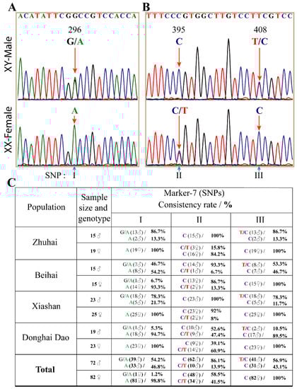 Based on the assembly of gDNA sequence from male and female spotted scat, markers were developed on sections of the sequence with insertions and deletions (indels). Five insertions and deletions were found, and five markers were designed. The marker with long indels (99 bp) was analyzed on agarose gel electrophoresis, while those with short indels (8 bp–14 bp) were analyzed on PAGE gel. According to the indel position, the markers spanning indel1, indel2, indel3, indel4, indel5, and del6 were named marker-1, marker-2, marker-3, marker-4, marker-5, and marker-6, respectively (Table 1), whereas marker-7 spanned across three SNPs (I, II, and III).