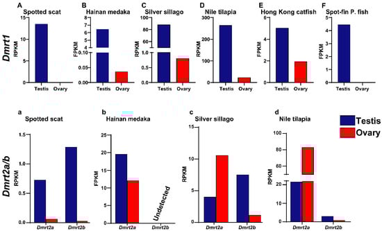 Gene expression in RPKM/FPKM obtained from gonad transcriptome data of (A,a) spotted scat [], (B,b) Hainan medaka [], (C,c) silver sillago [], (D,d) Nile tilapia [], (E) Hong Kong catfish [], and (F) spot-fine porcupine fish []. Dmrt1 is consistently expressed at higher levels in all testes. Dmrt2a is expressed at higher levels in the testes of spotted scat and Hainan medaka and the ovaries of tilapia and silver sillago. Dmrt2b, on the other hand, is expressed at higher levels in the testes of spotted scat and tilapia. Dmrt2a and Dmrt2b were not detectable in the transcriptome data for Hong Kong catfish and Spot-fin porcupine fish.