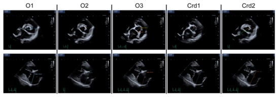 LA:Ao and LAAPD performed by different observers. The first row shows LA:Ao measurements of the same dog performed by different observers. The second row shows LAAPD measurements of the same dog performed by different observers. O1: veterinary student; O2: first-year cardiology resident; O3: third-year cardiology resident; Crd1: cardiologist 1; Crd2: cardiologist 2.