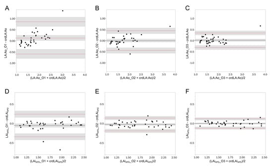 Bland–Altman plots of the left atrial measurements performed by observers with different levels of experience vs. the average of two cardiologists. The black line indicates the mean bias, while the red lines are the 95% limits of agreement. The shaded areas are the 95% CI of the estimates. (A–C) represents the difference of the measurements of left atrium to aortic root ratio of O1, O2, O3, respectively, plotted against the average left atrium to aortic root ratio of the two cardiologists. (D–F) represent the difference of the measurements of allometrically scaled left atrial anteroposterior diameter performed by O1, O2, O3, respectively, plotted against the average allometrically scaled left atrial anteroposterior diameter performed by the two cardiologists. crdLA:Ao: average of left atrium to aortic root ratio obtained by the two cardiologists; crdLAiAPD: average allometrically scaled left atrial anteroposterior diameter obtained by the two cardiologists; LA:Ao_O1: Left atrium to aortic root ratio obtained by O1; LA:Ao_O3: Left atrium to aortic root ratio obtained by O3; LA:Ao_O2: Left atrium to aortic root ratio obtained by O2; LAiAPD_O1: allometrically scaled left atrial anteroposterior diameter obtained by O1; LAiAPD_O3: allometrically scaled left atrial anteroposterior diameter obtained by O3; LAiAPD_O2: allometrically scaled left atrial anteroposterior diameter obtained by O2.
