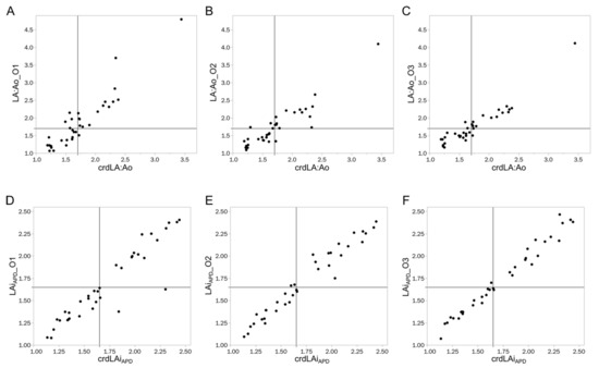Measurements of left atrium to aortic root ratio and allometrically scaled left atrial anteroposterior diameter obtained from observers with different levels of experience plotted against the average left atrium to aortic root ratio and allometrically scaled left atrial anteroposterior diameter obtained by the two cardiologists. The lines indicate the cutoff for left atrial enlargement (1.7 for left atrium to aortic root ratio, 1.65 for allometrically scaled left atrial anteroposterior diameter). (A–C) represents the measurements of left atrium to aortic root ratio of O1, O2, O3, respectively, plotted against the average left atrium to aortic root ratio of the two cardiologists. (D–F) represent the measurements of allometrically scaled left atrial anteroposterior diameter performed by O1, O2, O3, respectively, plotted against the average allometrically scaled left atrial anteroposterior diameter performed by the two cardiologists. crdLA:Ao: average of left atrium to aortic root ratio obtained by the two cardiologists; crdLAiAPD: average allometrically scaled left atrial anteroposterior diameter obtained by the two cardiologists; LA:Ao_O1: Left atrium to aortic root ratio obtained by O1; LA:Ao_O3: Left atrium to aortic root ratio obtained by O3; LA:Ao_O2: Left atrium to aortic root ratio obtained by O2; LAiAPD_O1: allometrically scaled left atrial anteroposterior diameter obtained by O1; LAiAPD_O3: allometrically scaled left atrial anteroposterior diameter obtained by O3; LAiAPD_O2: allometrically scaled left atrial anteroposterior diameter obtained by O2.