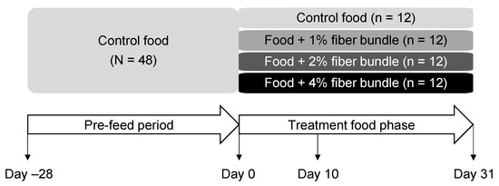 A total of 48 healthy adult dogs (24 female, 24 male), all spayed or neutered and owned by Hill’s Pet Nutrition, Inc., were included. Dogs were housed at the Pet Nutrition Center in pairs with regular access to natural light, daily exercise, and socialization opportunities. All dogs were fed the control food for 28 days and then divided into four groups of 12 dogs each based on their sex, age, and body weight (Figure 1). Each group continued into the treatment phase in a parallel experimental design with consumption of the control food or foods with the fiber bundle added to 1%, 2%, or 4% for 31 days. Feeding each dog the control food prior to the treatment food phase should reduce the individual effect in the later microbiota analysis. Each dog was fed based on their caloric requirements as calculated by their body weight. All dogs were healthy at the end of the study, with no adverse events reported.
