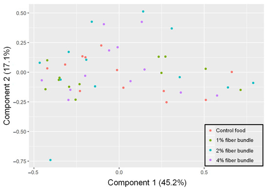 Principal coordinate analysis plot of the fecal microbiome of dogs that consumed foods containing 0%, 1%, 2%, or 4% of added fiber-bound polyphenol ingredients for 31 days.
