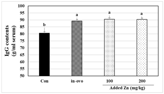 The effects of in ovo injected and supplemental Zn on leukocytes and erythrocytes are shown in Table 4. No significant differences were found in leukocyte, red blood cells, hemoglobulin (Hb), hematocrit (HCT), mean corpuscular hemoglobulin, and mean corpuscular hemoglobulin concentration levels in broiler blood. However, significant differences were found in the mean corpuscular volume. The effects of in ovo injected and supplemental Zn on IgG in broiler blood are shown in Figure 1.