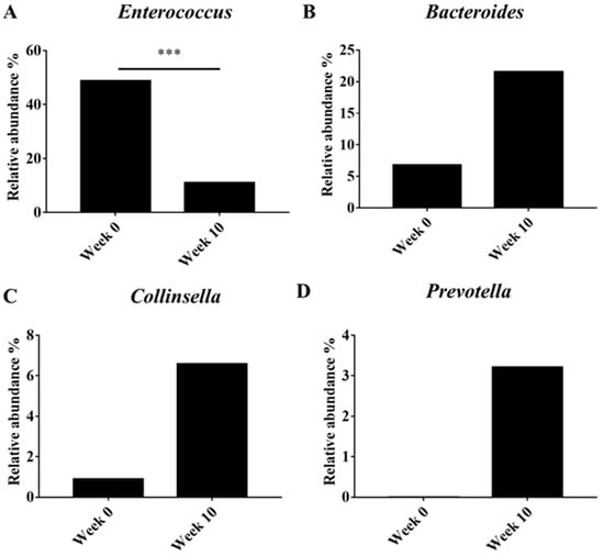 Beta diversity (PCoA) analysis confirmed that the microbiota composition showed significantly different clustering before and after synbiotic preparation containing L. gasseri BNR17 supplementation (Figure 1). At the phylum level, the bacterial sequences from the 0-week samples were composed predominantly of the phyla Firmicutes (80.07%), Proteobacteria (13.48%), Bacteroidetes (3.93%) and other phyla of the total sequences analyzed (Figure 2A). The 10-week samples consisted largely of the phyla Firmicutes (59.41%), Bacteroidetes (18.34%), Fusobacteria (10.73%) and other phyla of the total sequences analyzed (Figure 2A). At the genus level, Enterococcus was the most enriched genus in the 0-week samples (48.82%; Figure 2B), whereas Blautia was the most enriched genus in the 10-week samples (24.35%; Figure 2B). The relative abundance of Enterococcus decreased significantly from an average of 48.82% in the 0-week samples to 10.98% in the 10-week samples (Figure 3A). The relative abundance of Bacteriodes, Collinsella and Prevotella showed increased propensity from 6.81%, 0.90%, and 0.00% in the 0-week samples to 21.58%, 6.59%, 3.21% in the 10-week samples, respectively (Figure 3B–D).