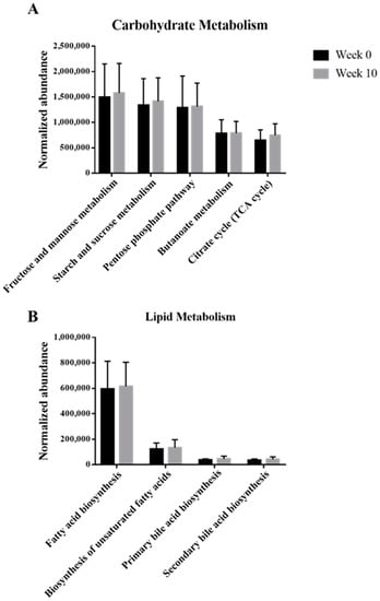 Functional annotation of the gut microbiomes between week 0 and 10 with the administration of the synbiotic preparation containing L. gasseri BNR17. Normalized abundance of the level 2 KEGG subsystem classified reads associated with the metabolism of carbohydrate (A), and lipid (B). The error bars show the calculated standard error of the means of five replicates of the samples.