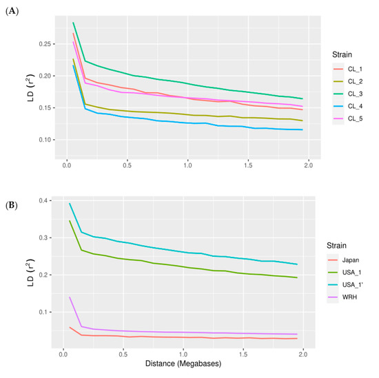 Decay of the average linkage disequilibrium (LD) genome-wide, measured as r2 against physical distance (Mb): (A) Chilean strains, and (B) North American strains and Japanese strains.