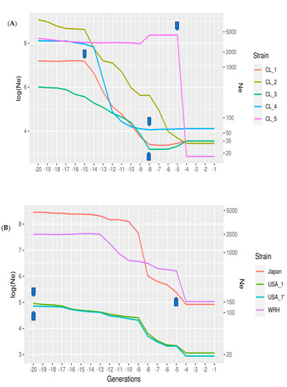 Estimates of the effective population size (Ne) on a logarithmic scale (log), second Y axis actual Ne) within the last twenty generations, reflecting the time over which different strains were established. Each strain was analyzed using the methods of [25]: (A) Chilean strains, and (B) North American strains and Japanese strains. Arrows (Blue) denote the most likely generation when the breeding program was started (Table S1).