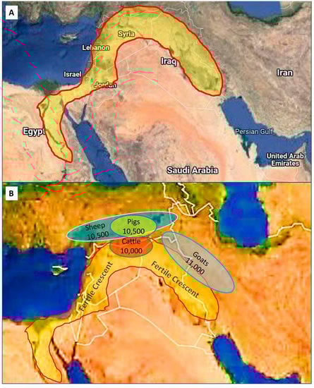 Despite the uncertainty of the exact dates and mechanisms of very early domestication, it is known where it started in more recent times during the Neolithic Era. The Fertile Crescent, also sometimes referred to as “the cradle of civilization”, was situated in the Near (Middle) East and was known for its fertile soils and are fed by four rivers, namely the Tigris, Euphrates, Jordan, and Nile (Figure 2). Geographically this area, traditionally known as Mesopotamia, and its adjacent areas overlap with parts of Israel, Egypt, Palestine, Turkey, Iraq, Iran, and Syria in modern times. Edible wild crops such as barley and wild wheat were abundant in the Fertile Crescent (these were cultivated in the Neolithic Era) and, together with plentiful grasslands, these areas were populated by herds of many types of mammalian herbivores [1].