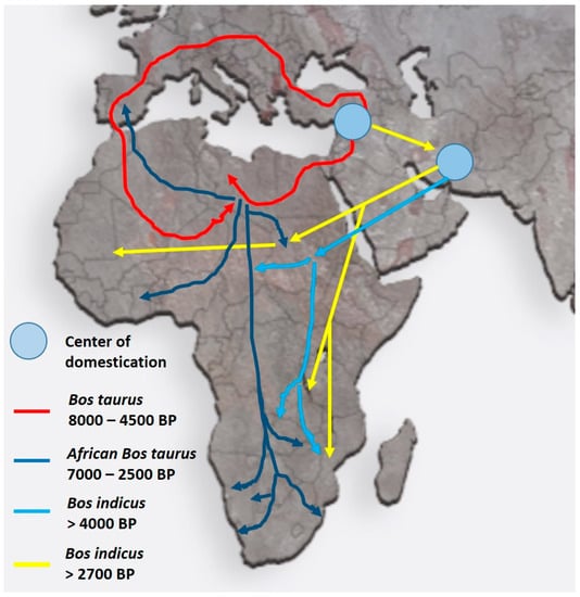 This review concentrates on domestic animals in Africa (as an example), and it is conceivable that the various domestic breeds that originated in the Fertile Crescent were similarly relocated either with their human counterparts or on their own to “greener pastures”. Figure 3 shows, as an example, the migratory cattle routes for both Bos taurus (humpless) and Bos indicus (with a hump, derived from Zebu) from the Fertile Crescent into Africa. These migrations apparently took place as early as 10,000 BP for B. taurus and 4000 BP for B. indicus to reach the more southern parts of Africa [10,11,12]. During their voyage into Africa, animals were exposed to a multitude of new challenges ranging from droughts, shortage of food, endo- and ecto-parasites, as well as the Anopheles mosquito, the vector causing malaria via trypanosomes in both humans and cattle [12]. While B. taurus was resistant to malaria, this was less so for B. indicus. More recent information indicates that B. indicus had some resistance to trypanosomes and was tolerant to dry conditions, heat tolerant, and less prone to tick infections [12].