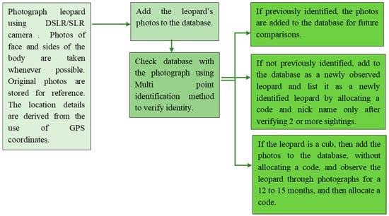 Therefore, to overcome the above-mentioned challenges and weaknesses of the existing methods for the identification of individual leopards, we aimed to develop a method for leopard identification that does not result in a duplicated count during surveys. With the assumption that leopards change their spots over time due to observed or unobserved injury, we monitored a set of selected leopards for a longer period of time. We also observed a wide area of the facial and flank area of leopards. Our aim was to develop a non-invasive, quick, and accurate method that could be employed for Sri Lankan leopards.