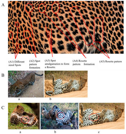 The color of a leopard’s skin coat between the blackish spot and rosette formations is rust yellow on the sides of the body, face, upper area of the leopard’s body, and tail, as shown in Figure 2B(a). The color of the coat underneath the leopard’s body and on the inner sides of the legs of the leopard is white or a mix of white and off-white. The whitish part, shown in Figure 2B(b), only consists of spot markings, and no rosette markings are present.