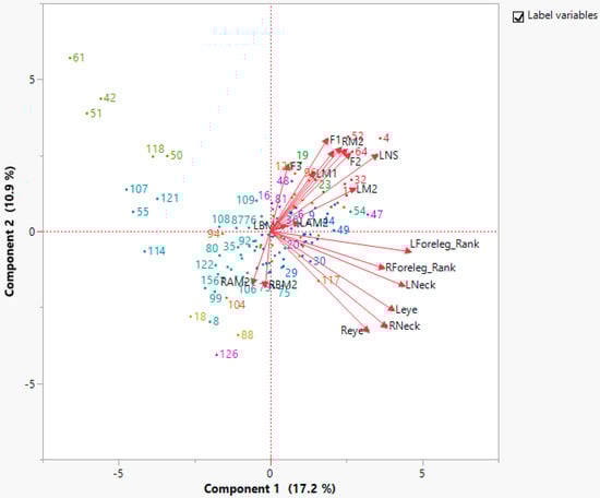 According to the principal component analysis, the first eight principal components have eigenvalues greater than one (Supplementary Table S1). Together, these eight components only explain 69.9% of the variation in the data. Since only a small amount of data can be explained by all of the right components, it is hard to say whether there is a correlation between each multi-point location and each individual (Figure 3). Therefore, each and every spot area is important for identifying an individual, and at least nine spot areas—F1, F2, F3, RM2, LM2, LM1, RM1, LNS, and RNS—should be considered.