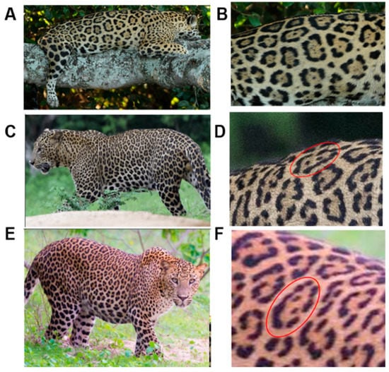 Therefore, this newly introduced multi-point leopard identification method overcomes the inaccuracies and errors that can occur during the visual identification of leopards. In the wild, leopards are identified using capture and recapture methods, and for a long time, leopard populations were estimated by observing their markings and assuming that the spot and rosette markings do not change [15,17,37]. In 2013, Hunter mentioned that the rosette and spot patterns that are unique to individuals could be useful for identification [38].